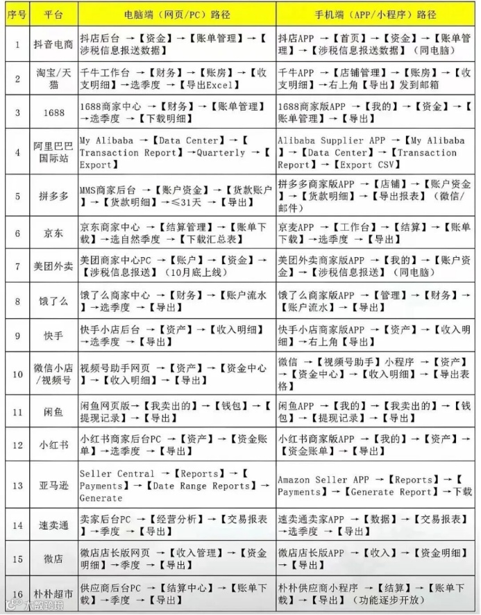 本月以来,各大电商平台陆续更新了涉税信息报送功能。一张详细的平台操作路径表格在业内流传,清晰展示了16家主流的电商平台均已上线涉税信息报送或账单导出功能。