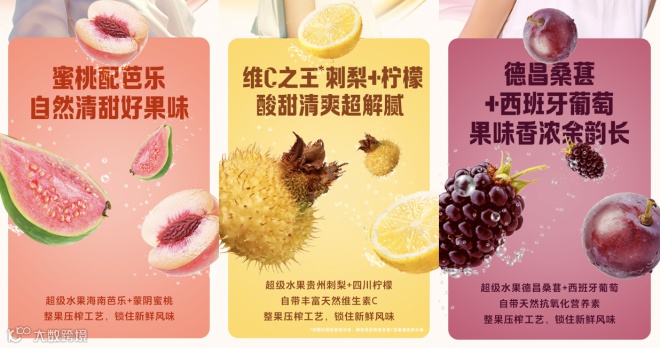 然而,产品并非简单添加果汁,而是精心甄选与所补充维生素高度关联的“超级水果”进行复配。多维C,选用“维C之王”刺梨搭配四川柠檬;多维B,则选用海南芭乐搭配蒙阴蜜桃。多维E,选用德昌桑葚搭配西班牙葡萄,这种“超级水果+高价值水果”的1+1组合,不仅保证了营养素的天然来源,更带来了层次丰富、清爽不甜腻的口感。让维生素补充从一种为了健康的“被动任务”,升华成为一种愉悦的“主动享受”,成功塑造了“更好喝的维生素果汁饮料”的鲜明认知。
