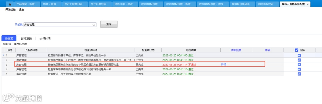3、以上两步做完还是对不上,大概率可能是个别单据没有更新即时库存,可以尝试做库存云巡检,看是否会提示报错