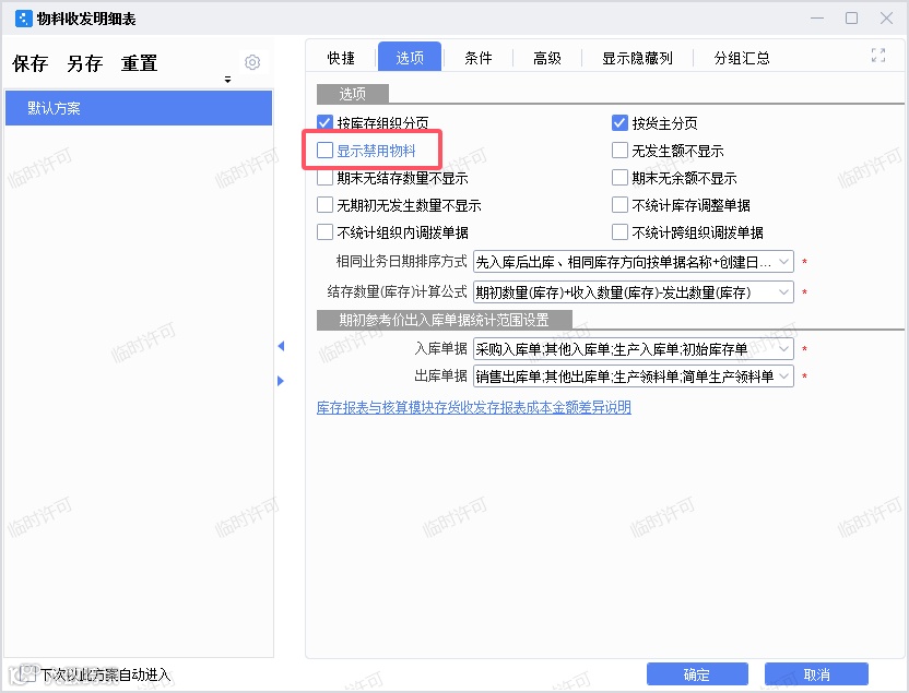 当物料禁用且禁用的时候有库存的情况下,即时库存可显示禁用的物料的库存,物料收发汇总表/物料收发明细表中是否显示禁用的物料的数据,取决于参数【显示禁用物料】是否勾选: