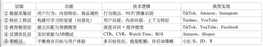 这一五层架构决定了所有平台的算法决策流程:采集数据 → 表征内容 → 预测兴趣 → 调整推荐 → 优化转化。差异在于:内容平台更重“情绪反馈与停留时长”,电商平台更重“点击率与转化路径”。