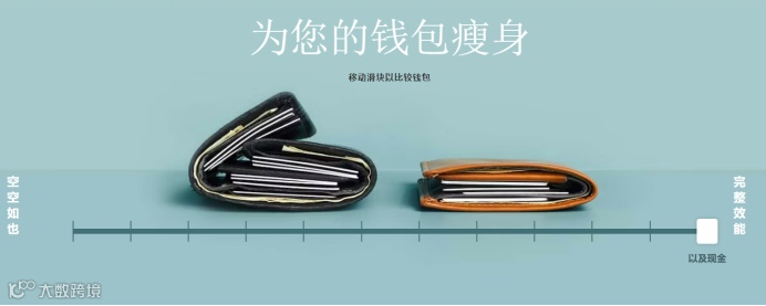 在Bellroy官网上,有普通钱包与Bellroy钱包的放置同等物件分别的状态,鲜明对比下,Bellroy钱包更加轻薄、苗条,方便携带,通过收纳效果对比,能够激发用户的购买欲。