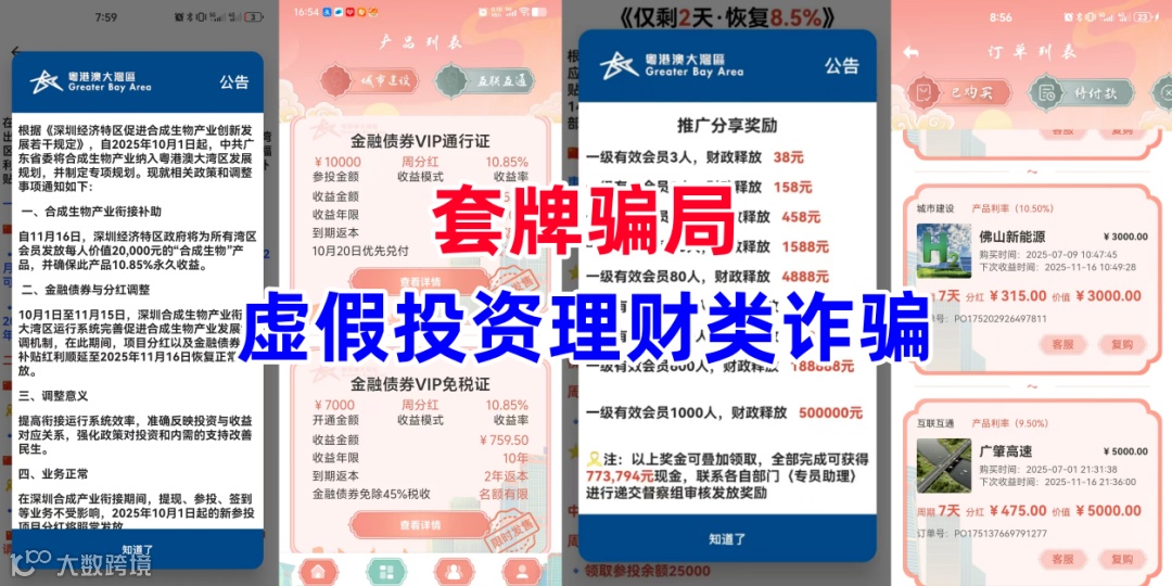 近期,一系列精心伪装、极具迷惑性的虚假理财应用与传销骗局频繁出现,它们或冒用知名机构名义,或虚构国家背景项目,以“高额返利”“稳赚不赔”为诱饵,实则进行诈骗、非法集资乃至洗钱等违法犯罪活动。