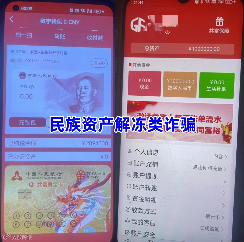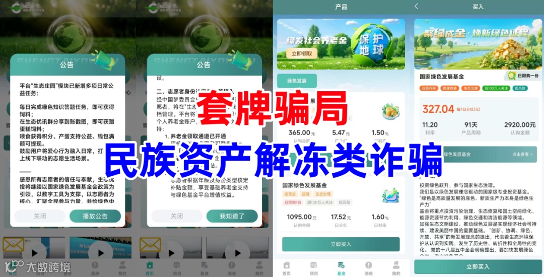 民族资产解冻类诈骗。不法分子冒充“国家绿色发展基金”的名义,打着“东望志愿者回归”的旗号,宣传回归者可领取养老金,虚构推广“国家绿色发展基金”等高额返利理财项目。