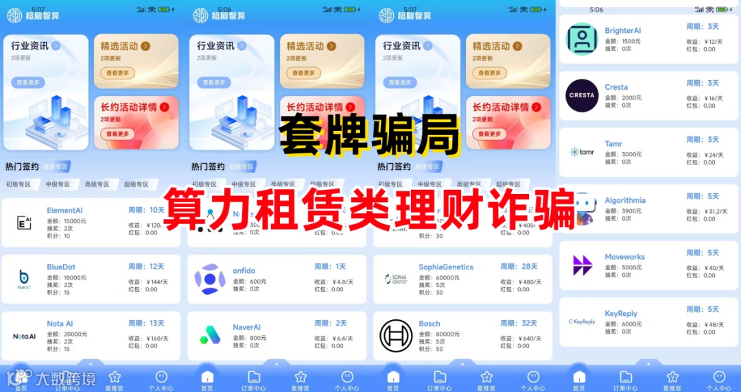 算力租赁类骗局。不法分子冒充香港某公司的名义,制作散布涉诈APP,打着算力租赁的旗号,虚构推广“ElementAl”“BlueDot”“Numenta”“NaverAl”等高额返利理财项目。