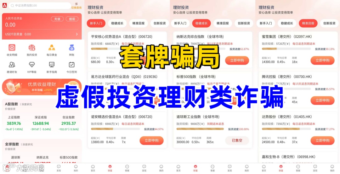 冒牌的虚假理财诈骗。不法分子冒充境外合格投资者“艾克投资”公司的名义,制作散布涉诈APP,虚构推广“平安核心优势混合A”“易方达全球医药行业混合”“标普500指数”“纳斯达克综合指数”“道琼斯工业指数”等每日返息到期返本高额返利理财项目。