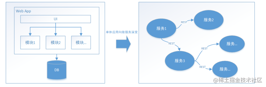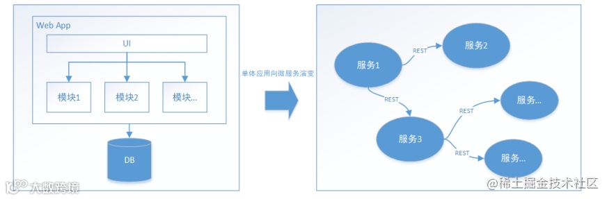 随着互联网的快速发展,软件系统由原来的单体应用转变为分布式应用,下图描述了单体应 +用向微服务的演变:分布式系统会把一个应用系统拆分为可独立部署的多个服务,因此需要服务与服务之间远程协作才能完成事务操 作,这种分布式系统环境下由不同的服务之间通过网络远程协作完成事务称之为分布式事务,例如用户注册送积分 事务、创建订单减库存事务,银行转账事务等都是分布式事务。