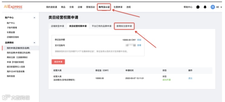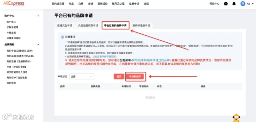 若需要使用的商标无相关查询结果,需要通过以下步骤将商标添加至平台的品牌库:(登入后台-账号及认证-新商标注册申请-点击新商标注册)