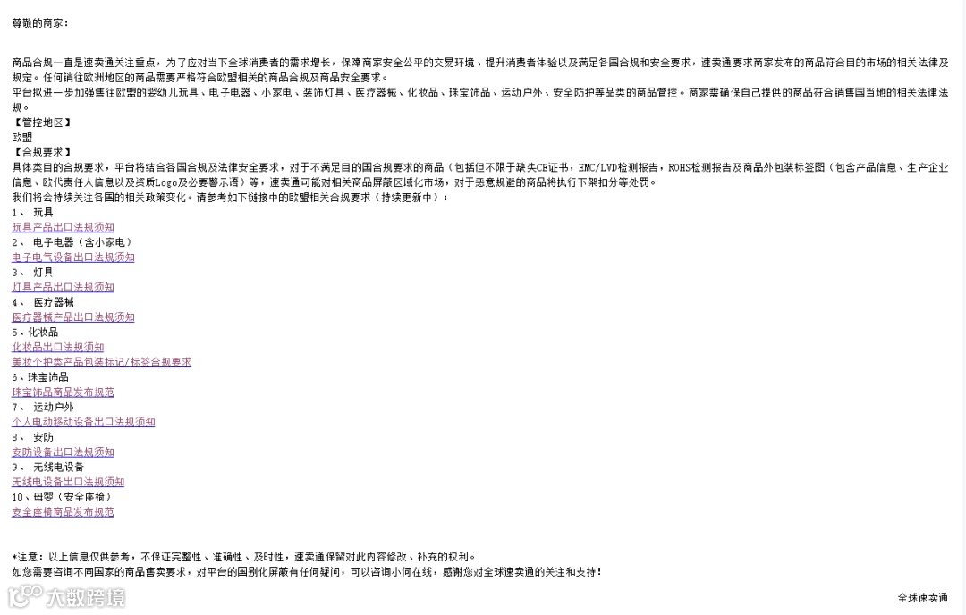 商品合规一直是速卖通关注重点,为了应对当下全球消费者的需求增长,保障商家安全公平的交易环境、提升消费者体验以及满足各国合规和安全要求,速卖通要求商家发布的商品符合目的市场的相关法律及规定。任何销往欧洲地区的商品需要严格符合欧盟相关的商品合规及商品安全要求。