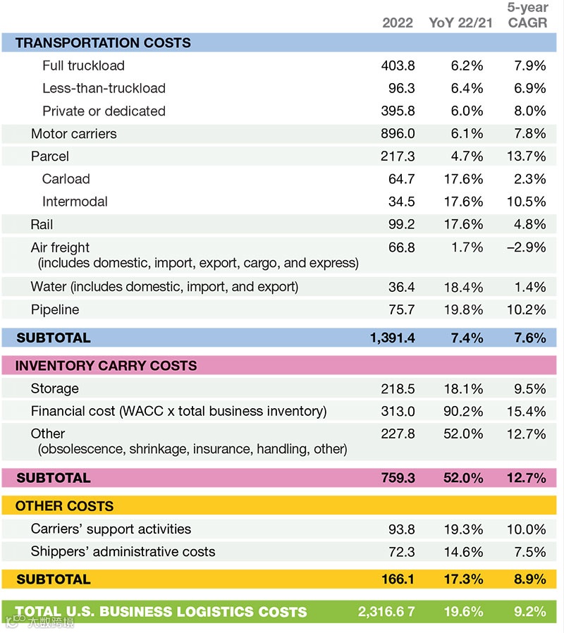 2021年至2022年期间,美国商业物流成本(以亿美元计)增长了19.6%