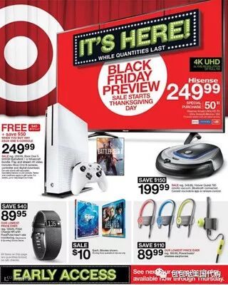 塔吉特是目前美国第二大的零售百货集团。除了黑五当天,从11月22日起,提供部分6折的床上用品,儿童玩具额外优惠,家电促销活动。黑五当天还推出几个家电的特别活动,例如只能扫地机器人199.99美金,平衡车289.99美金。