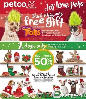 目前最常见的宠物用品店只要黑五当日,几乎所有类型的宠物食品、用品统统参与折扣。像是五折的宠物毯子,十几刀的狗窝,各种促销的宠物零食和半价衣服数不胜数。家养小宠的亲们现在就可以开始关注一下,目前已经开始了部分7.5折优惠哦。推荐阅读:美国实用宠物用品大推荐