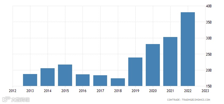 2022年沙特阿拉伯的进口额为1883.1亿美元,相比2021年增长了352.3亿美元,同比增长23.17%。2022年,中国对沙特阿拉伯出口商品总值为379.9亿美元,相比2021年增长了76.7亿美元,同比增长25.3%。