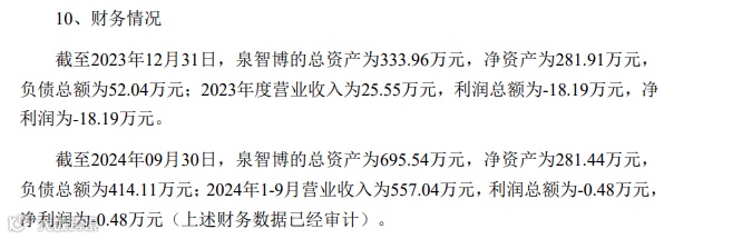 截至2024年9月30日,泉智博总资产695.54万元,净资产281.44万元,负债414.11万元;2024年1-9月实现营收557.04万元,净亏损0.48万元[k]。