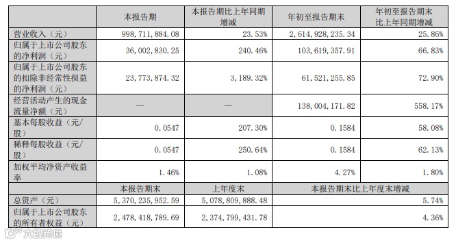 财务数据显示,蓝黛科技2024年业绩表现强劲:第三季度营收达9.99亿元,同比增长23.53%;归母净利润3600.28万元,同比增长240.46%[k]。前三季度累计营收26.15亿元,同比增长25.86%;归母净利润1.04亿元,同比增长66.83%[k]。