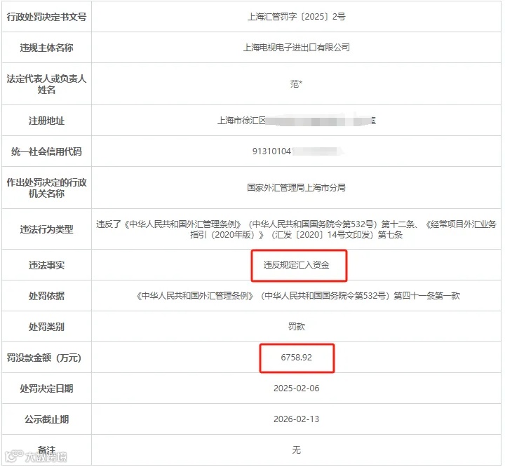 2025年2月,上海电视电子进出口有限公司因违反规定汇入资金,被国家外汇管理局上海市分局处以6758.92万元罚款[k]。