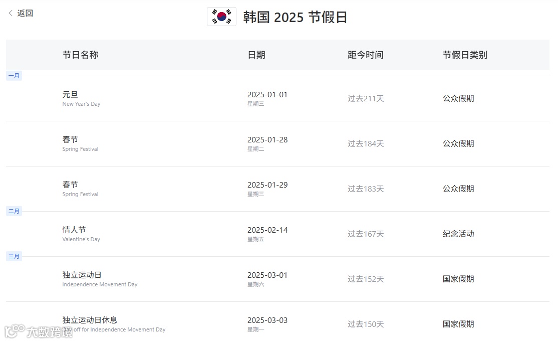 数据全面:涵盖了韩国所有法定节假日、传统节日以及一些具有重要商业意义的纪念日等,确保信息的完整性。