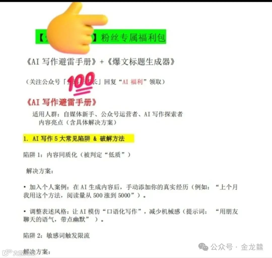 送AI公众号必备资料包,微信回复:【AI福利】,领取《AI写作避雷手册》+《爆文标题生成器》,(内含5大陷阱+3大核心技巧)
