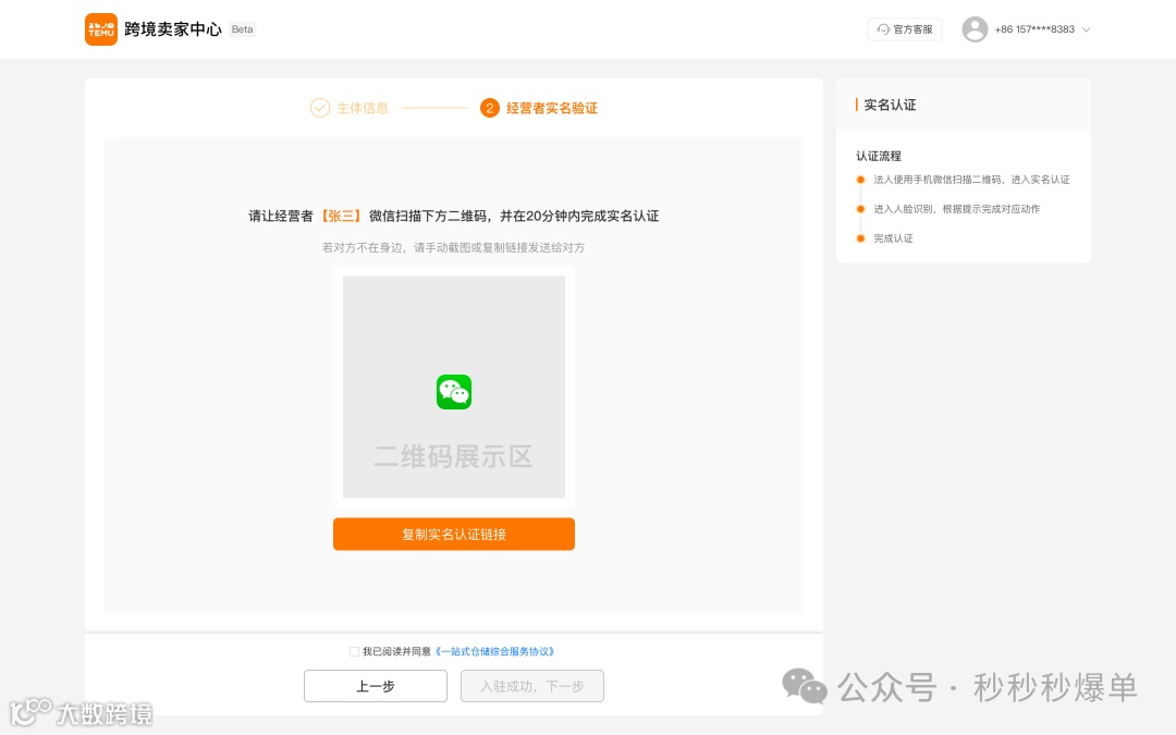 正确填写以上信息后,开店人/经营人/法人/董事/管理人进行实名认证,需要使用手机扫描二维码,并根据手机页面提示,完成对应动作,直至手机上提示“实名认证通过”后,在电脑上点击【入驻成功,下一步】,完成认证