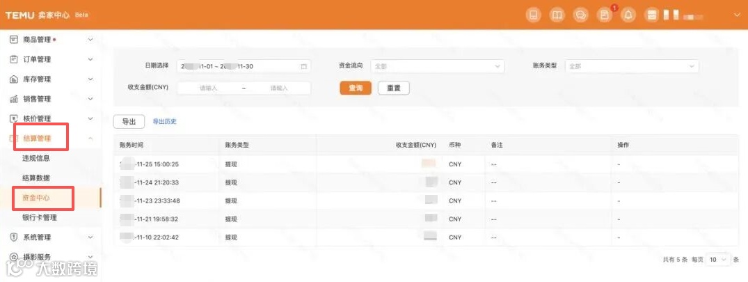 货款账户的每笔入账明细都可以在该页面查看,包含充值、提现、结算等信息。