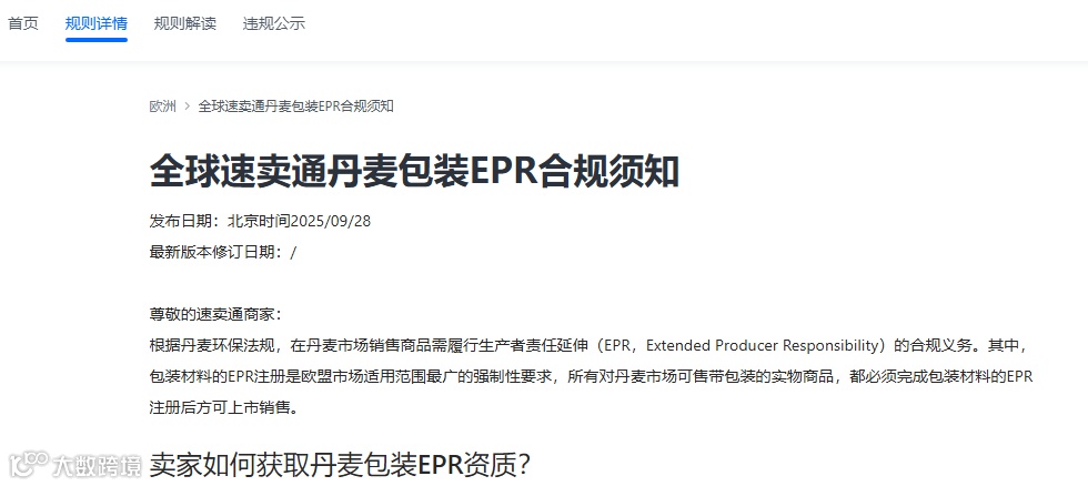 其中,包装材料的EPR注册是欧盟市场适用范围最广的强制性要求。因此,速卖通平台继强制要求丹麦电池法后,也开始管控丹麦包装法。