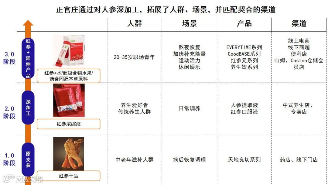 正官庄的破局历程,则是一部“向深加工要价值,向新人群要流行”的战略教材,通过“产品形态、功能延伸、场景挖掘”三个维度,实现从1.0阶段到3.0阶段的逐级递进,最终将红参从传统药材原料,迭代为适配多元需求的大众化流行饮品。