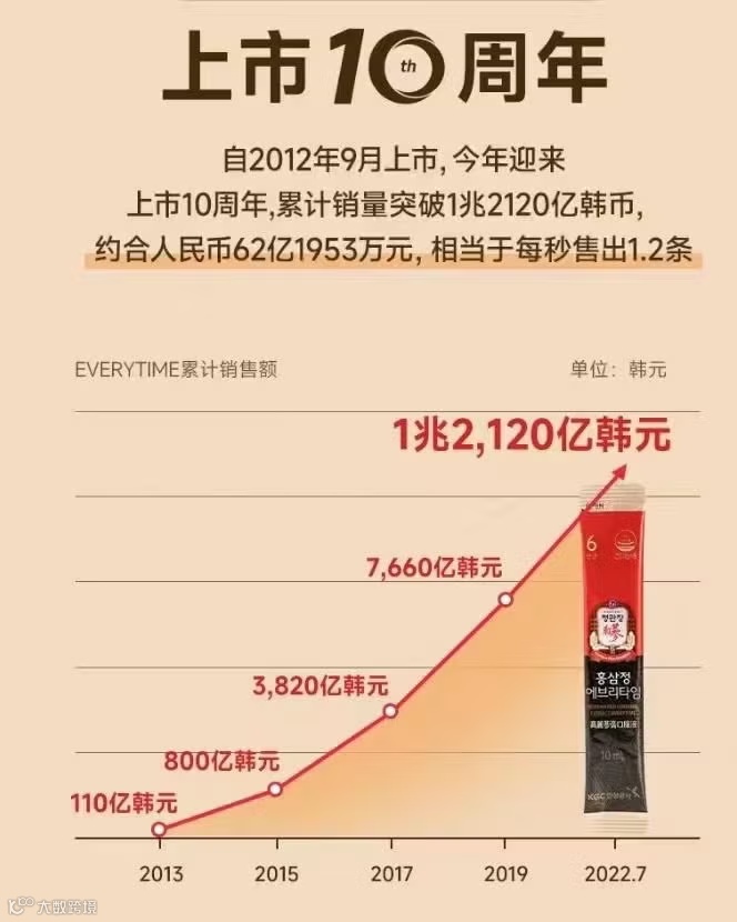 这是一个教科书级的商业样本:连续11年蝉联全球人参销量第一,全球年销售额突破10亿美元(超70亿人民币),市场份额高达41.9%。“EVERYTIME系列”上市10周年,累计销量突破1兆2120亿韩元(约合62亿人民币),相当于每秒售出1.2条,是名副其实的超级大单品。