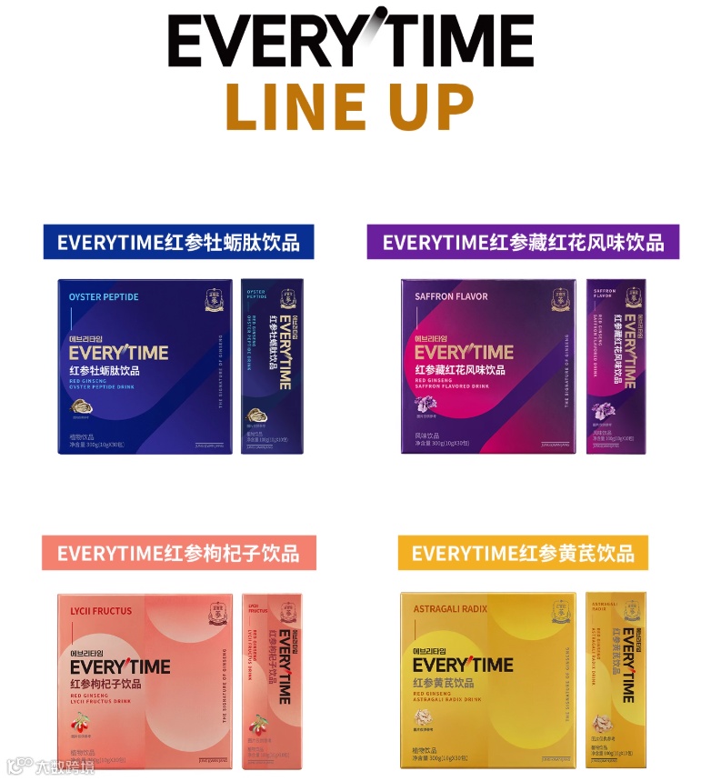 EVERYTIME系列作为正官庄攻占年轻化市场的主力产品,通过丰富的产品矩阵实现了对多元需求的精准覆盖。在保留红参浆的基础上,还进一步丰富产品矩阵,调节浓度、丰富口味,复配健康原料——复配黄芪,适配职场女性气血调理需求,或添加男性活力补充原料牡蛎肽。“红参+不同药食同源成分”的复合配方,覆盖了年轻人不同健康需求,成功让曾对红参敬而远之的年轻职场人,重新认识这一韩国国民品牌。