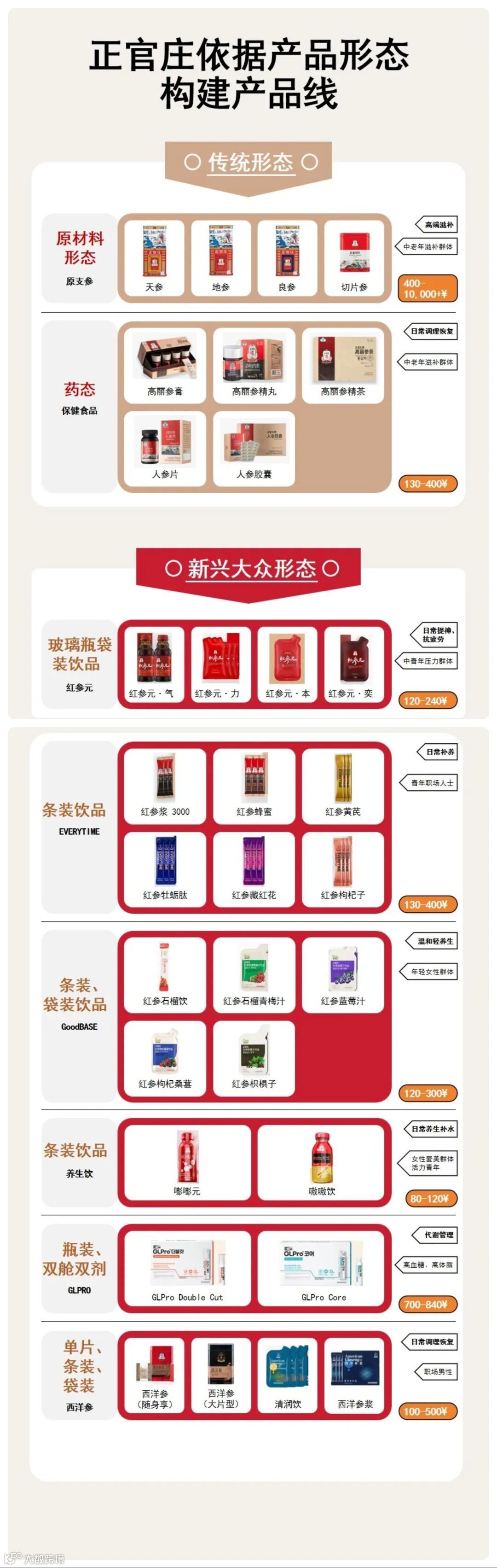 正是基于这种全球视野下的食品类别定位,正官庄才得以构建“形态维度(传统+新兴)×人群维度(全人群+细分人群)”的双轴产品矩阵。以传统形态守住专业根基,以新兴形态开拓增量市场,通过细分人群产品穿透需求壁垒,最终形成无死角的需求覆盖网络。