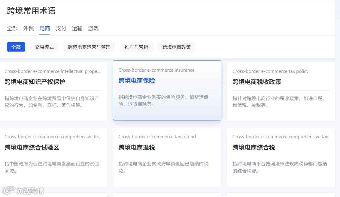 大数跨境常用术语查询工具是一款专为跨境电商从业者设计的在线工具,旨在帮助用户快速理解和查找与跨境相关的各种术语。