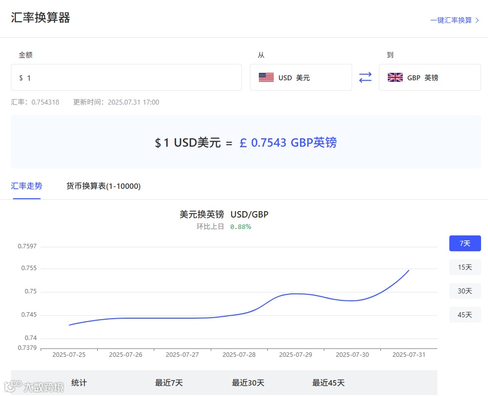 - 英镑金额 (GBP) = 美元金额 (USD) × 当前美元兑英镑汇率 (GBP/USD)