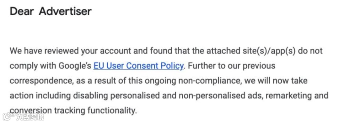 谷歌在通知中告知不合规的广告主:“经审核,我们发现您账户关联的网站/应用不符合谷歌的欧盟用户同意政策。鉴于这一持续违规行为,我们已多次沟通,现决定采取以下措施:停用针对欧盟用户的个性化与非个性化广告、再营销以及转化跟踪功能。”