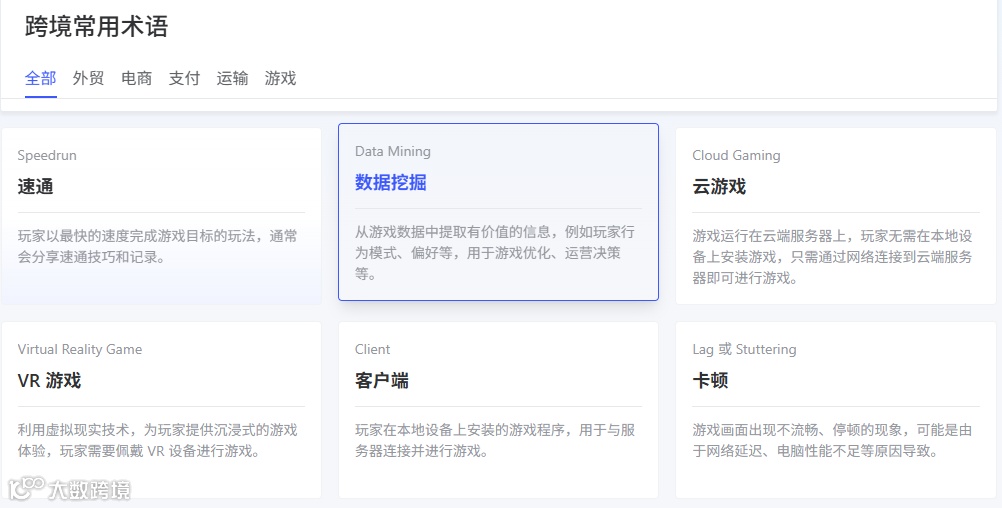 大数跨境常用术语查询工具是一款专为跨境电商从业人员设计的在线查询工具,涵盖了众多电商平台、物流及支付相关术语的解析。