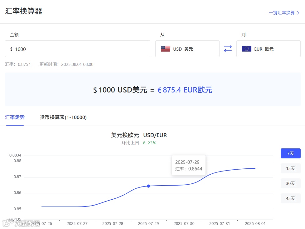 $1000USD美元=€875.4EUR欧元