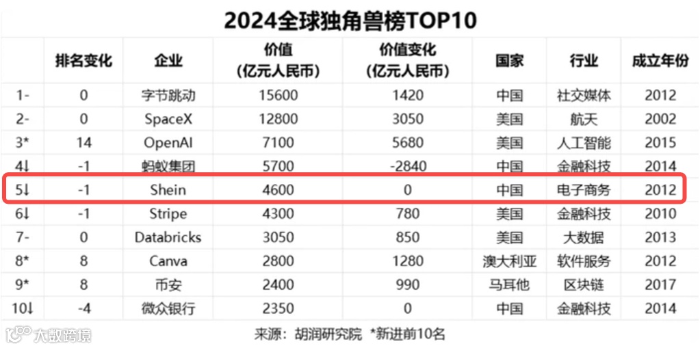 凭借出色的市场表现,希音在《2024全球独角兽榜》中估值高达4600亿元,位列全球第五,并与速卖通、Temu、TikTok Shop并称为中国跨境电商的“出海四小龙”。
