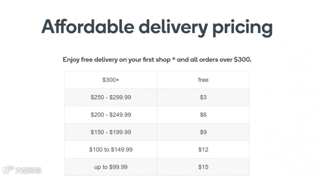Woolworth 送货费用为第一次线上购物超过澳币100刀 或一次购物满300澳币即可免费送货上门。其余具体价格请参考下图