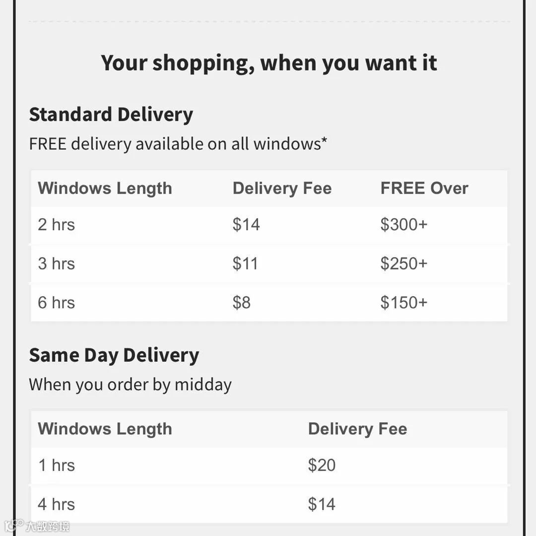 其中标准送货和当天送货(当天下午四点开始送货)有最低消费$50澳币的要求,第一次消费满100刀或根据允许配送的时间窗口来定价。
