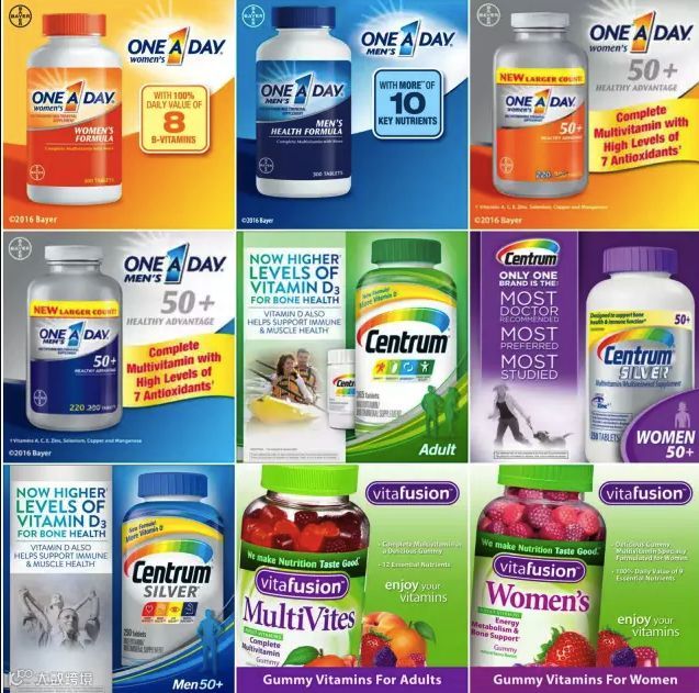 综合维他命系列:德国大药厂 Bayer 推出,主打吃一颗就可以补充一天份所需的营养补给,包含顾骨本的钙与维生素D、免疫系统与肌肤健康的维生素A,C,E以及硒(免疫系统)/ 铜(肌肤健康)、心血管保健的维生素B6, B12, C, E 和叶酸、补充人体活力的B群与铬以及其他营养素。一共四款,分别为 One A Day(分男女);One A Day 50+(50岁以上男女)。