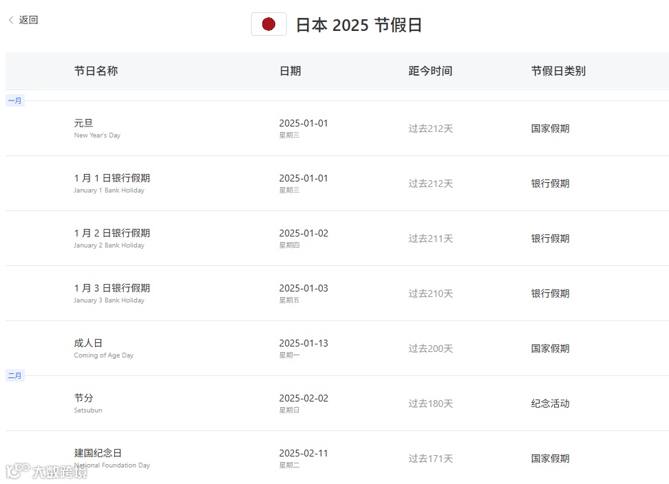 大数跨境网站的全球节日查询工具,旨在帮助跨境电商快速了解全球各大国家和地区的节日安排。用户可便捷筛选特定目标市场(如日本),获取全年所有重要法定节假日、传统民俗节庆的精确日期、节日名称。