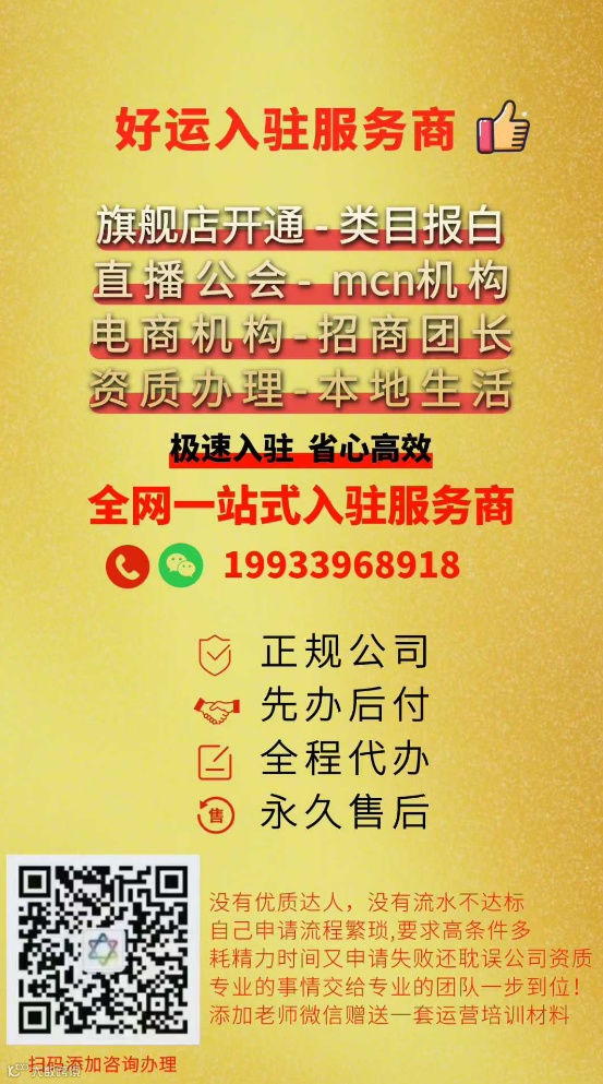 更多直播公会/招商团长/电商mcn机构/电商旗舰店/类目开通入驻细节,可关注公众号"好运文化传媒"分享详细入驻指南( JJHY1288 )