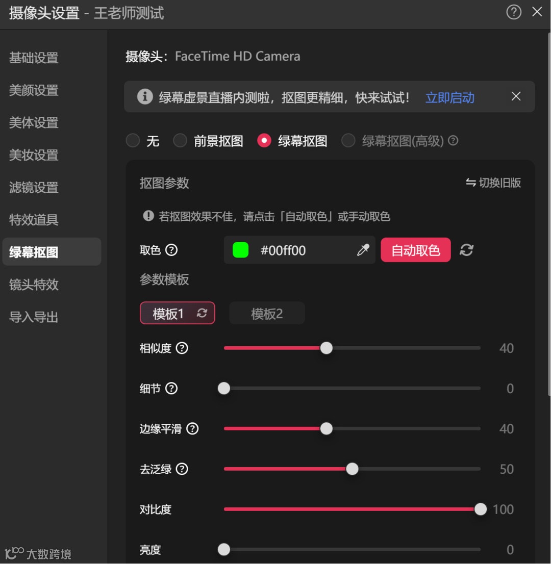 如果发现扣像不干净,这个可能收到环境灯光、绿幕是否褶皱,手机/相机等因素影响,自己调节一下相关配置和下面的参数