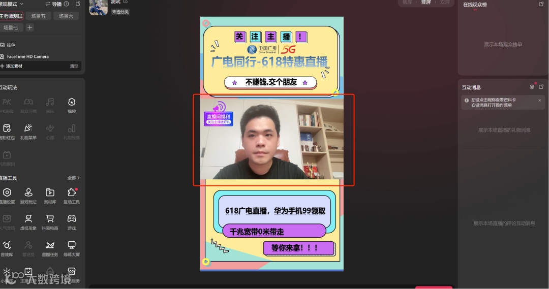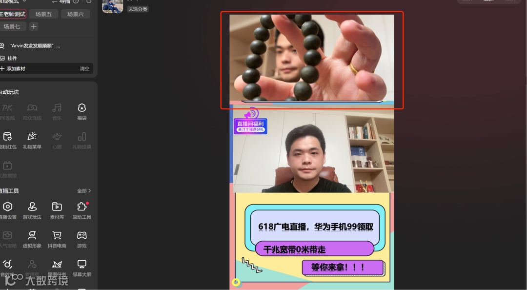 同学们可以看到有两个编辑界面,一个是预览画面,你在预览画面怎么操作都不会影响到直播间,直播画面就是粉丝现在看到的画面,你可以在直播的时候,在预览画面编辑好下一个出现的画面是怎么样(比如:特写镜头),点击同步至直播间,那么预览画面就会变成直播间画面!!!