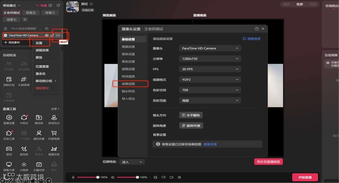 找到要扣像的摄像头-右边三个点-设置-绿幕抠图