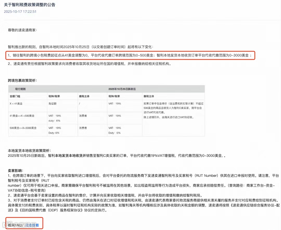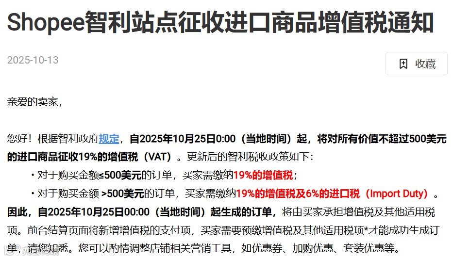 根据规定,自2025年10月25日(当地时间)起,Shopee智利站点将对所有价值不超过500美元的进口商品统一征收19%的增值税。