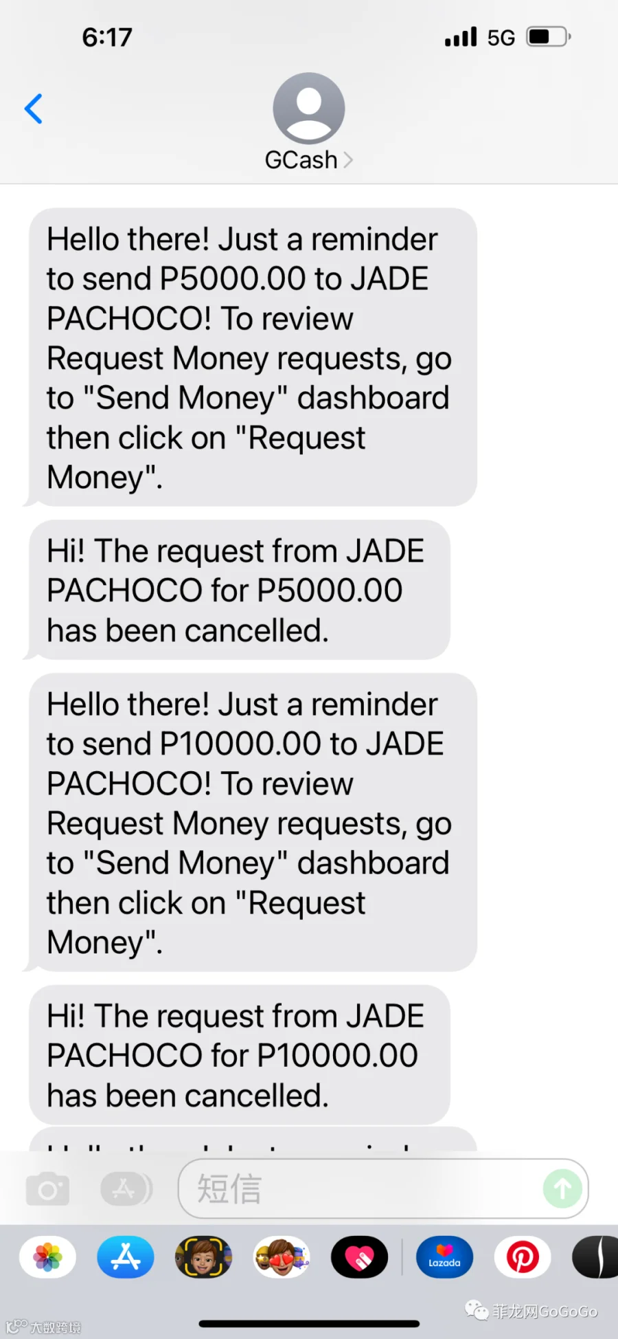 他们使用 Gcash 官方帐户向我发送了 5 条这样的短信,以验证取消交易。过了一会儿,他们让我给他们我的Gcash MPIN,所以我看到他们用Gcash官方账号给我发短信,所以我给了它,但在我给他们之前,我已经把所有的钱都转了出去。”