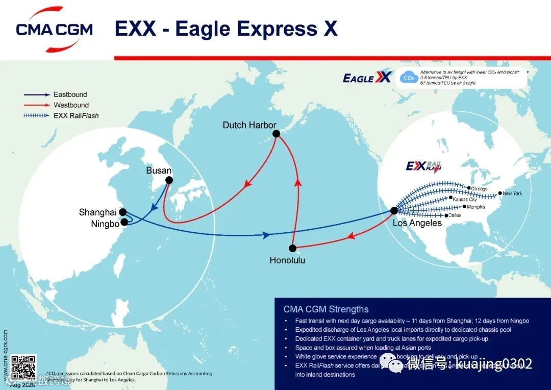 EXX快船(EagleExpress X,简称EXX)是CMA CGM推出的精品快航服务,提供中国东部港口至美国洛杉矶的高效海运方案[k]。
