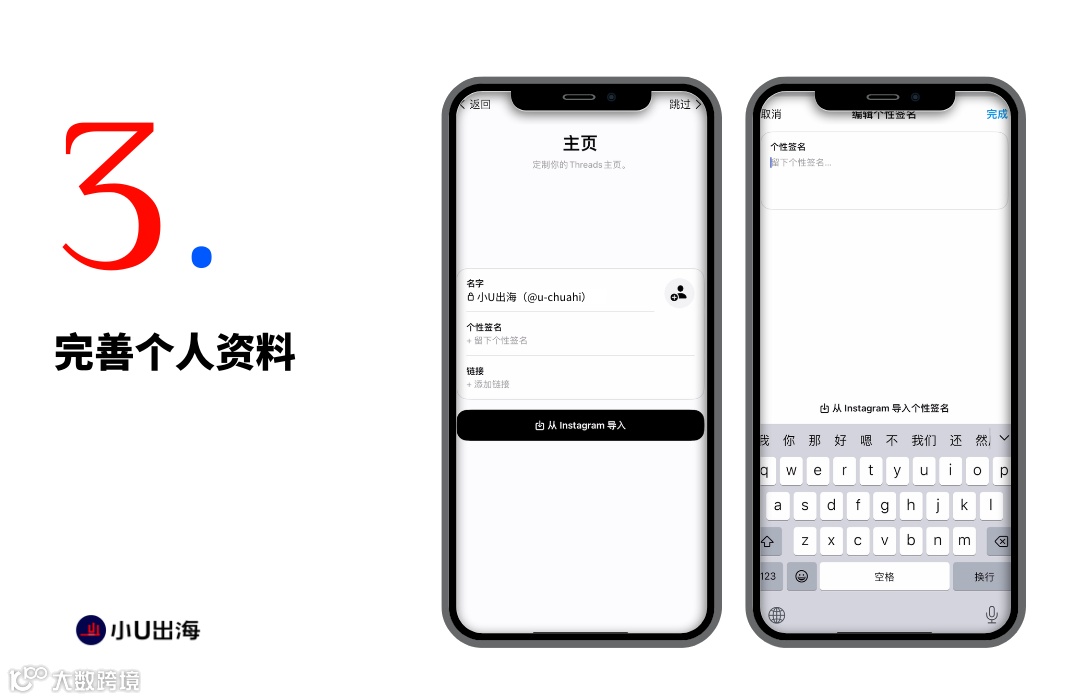 通过Instagram登录后,Threads 会同步 Instagram 上的姓名,如果要修改只能通过Instagram进行;但个人简介和链接是可以通过Threads直接修改的,也可以一键导入Instagram的资料。