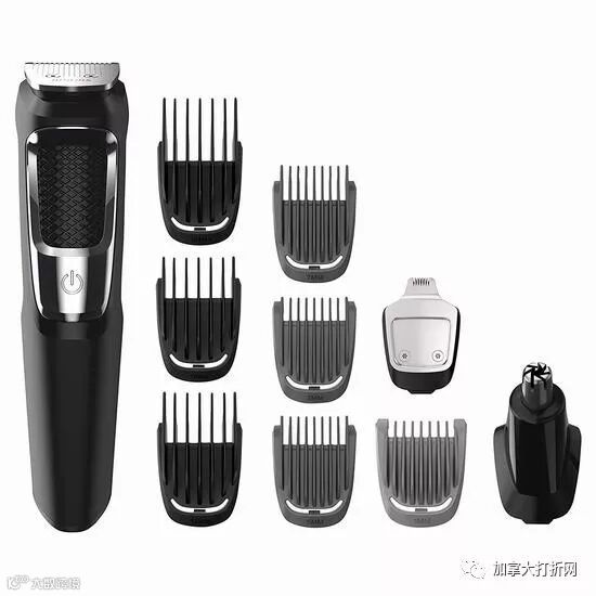这款修剪器包含13个配件,可用于头发修剪、面部修剪和身体修剪,内置全尺寸修剪刀头、精密微调修剪刀头、鼻孔和耳部修剪刀头3种刀头,9mm/13mm/16mm三尺寸头发修剪保护器,3个胡须修剪保护器以及1个胡茬修剪保护器,内置镍氢电池,充电8小时可使用60分钟,并支持5分钟快充使用1次,易清洗的防水设计,电压为110V~240V全球通用。适合经常出差或者旅行的男士使用,带1个就全都搞定了。
