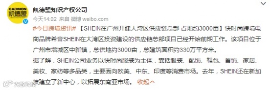 今年2月,据“中国广州发布”消息,SHEIN在大湾区投资建设的供应链总部项目已经开始了前期工作。该项目位于广州市增城区中新镇,总供地约3000亩,总建筑面积约330万平方米。