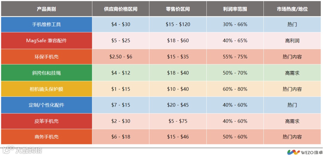 对于商务人士来说,功能性与时尚感向来不可分割。因此,既能保护手机又能低调彰显品位的出海商务壳,恰好成为他们的理想之选。这类产品的供货价集中在 6–18 美元,终端零售价可达 15–46 美元,毛利率约 50%–60%。